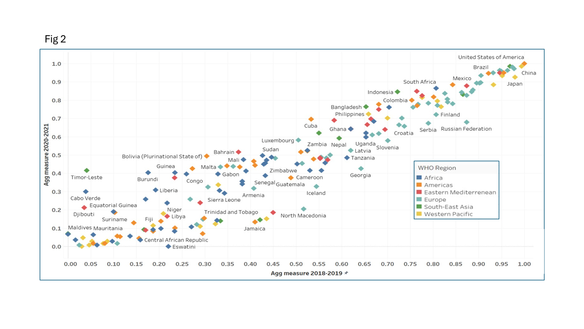 Photo courtesy of Peter KilmarxScatterplot of National Aggregate Metric of pre COVID research activity 2018–19 vs. National Aggregate Metric of COVID 19 related research output, 2020–21 in countries with population >100,000 (N = 180) [Click to see larger image]