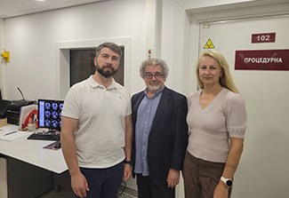 Photo courtesy of Tetiana NickelsenDr. Israel Liberzon (center) and Dr. Tetiana Nickelsen (right) meet with Ukrainian scientist, Dr. Oleksiy Omelchenko in a Kyiv radiology clinic.